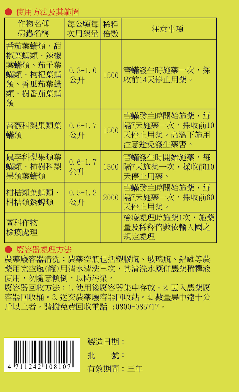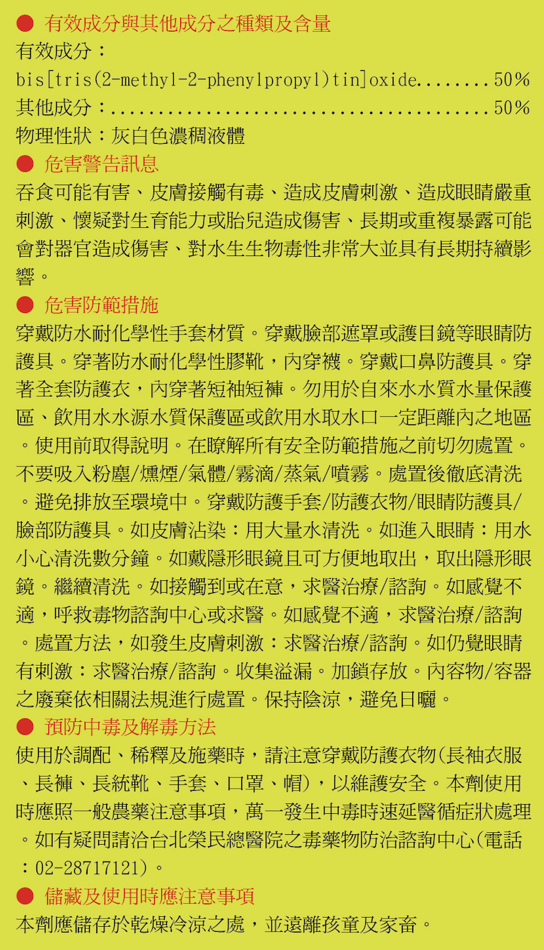 Next Product 剋蟎芬佈賜 水懸劑 (SC ) 50% 作用機制:殺蟎劑 12B 分類: A-殺蟎劑(ACARICIDE) 標籤: 正農產品 描述 描述 相關商品 Quick View Quick ViewF-殺菌劑(FUNGICIDE)金保淨查看內容 Quick View Quick ViewF-殺菌劑(FUNGICIDE)保穗旺查看內容 Quick View Quick ViewI-殺蟲劑(INSECTICIDE)練武功查看內容