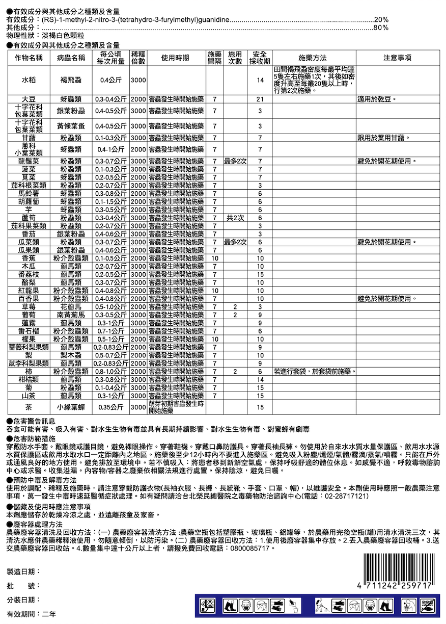 Previous Product 金光閃閃達特南 水溶性粒劑 (SG) 20% 作用機制:殺蟲劑 4A 對蜜蜂有劇毒性 分類: I-殺蟲劑(INSECTICIDE) 標籤: 東鋒產品 描述 描述相關商品 Quick View Quick ViewI-殺蟲劑(INSECTICIDE)蜱必寧查看內容 Quick View Quick ViewI-殺蟲劑(INSECTICIDE)允妥當查看內容 Quick View Quick ViewI-殺蟲劑(INSECTICIDE)穩淨查看內容